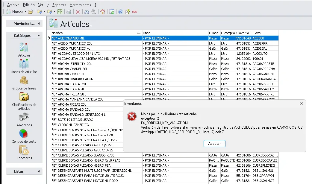 Espero que puedan ayudarme, lo que pasa es que tengo varios artículos que ya no quiero en el sistema, me gustaría eliminarlos, pero al intentar hacerlo me aparece el siguiente mensaje (adjunto imagen), también en algunos artículos me aparece que se encuentran en otra carpeta, ¿Cómo puedo saber en que carpeta se enucentran para quitarlo?.