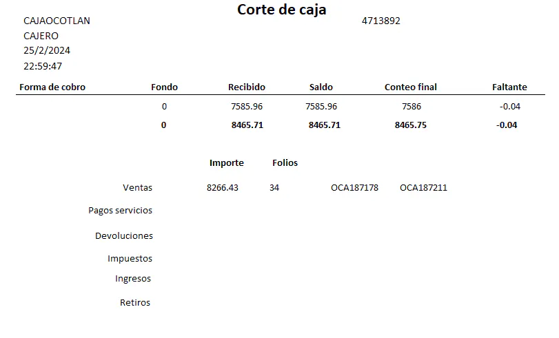 El único detalle es que no puedo iterar la impresión de las distintas formas de cobro. Adjuntaré una captura de pantalla en donde únicamente se imprime la forma de cobro: Efectivo (una disculpa, aún no agrego la variable para la forma de cobro). También cabe resaltar que los números en negritas es la suma de las columnas (recibido, saldo, conteo final, etc).