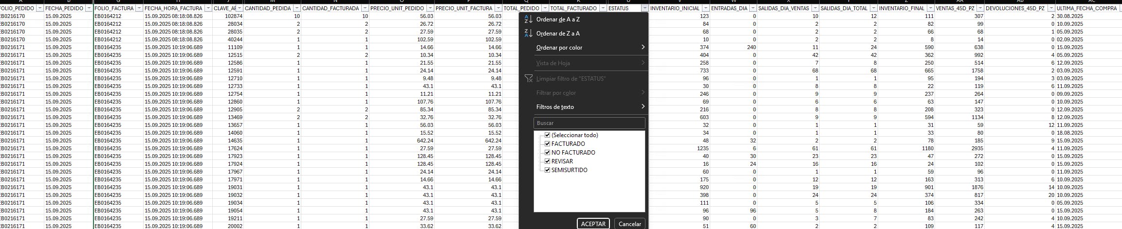 Se trata de un reporte de backorder con estatus, diseñado para dar visibilidad completa al proceso de surtido, facturación y movimientos de inventario.